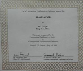 第26届国际乳头瘤病毒学术会议(The 26th International Papillomavirus Conference)于2010年7月3日至8日在加拿大蒙蒙特利尔市召开,博士研究生李阳和沈源明在学校研究生院研究生国际会议经费资助下参加了本次会议,其中博士生李阳(导师谢幸教授)的论文”microRNA profiles of cervical tissues and identification of mir-29 as HPV related miRNAs” 获得了国际乳头瘤病毒学会(IPVS)颁发的出席奖(Travel Award),获奖金1000USD,此项奖励为IPVS特别奖予世界各地在HPV研究领域表现优秀的学生及青年研究人员。本次会议共有45位青年学者和学生获得了该项奖励,李阳同学为中国大陆地区唯一获得此项奖励者。