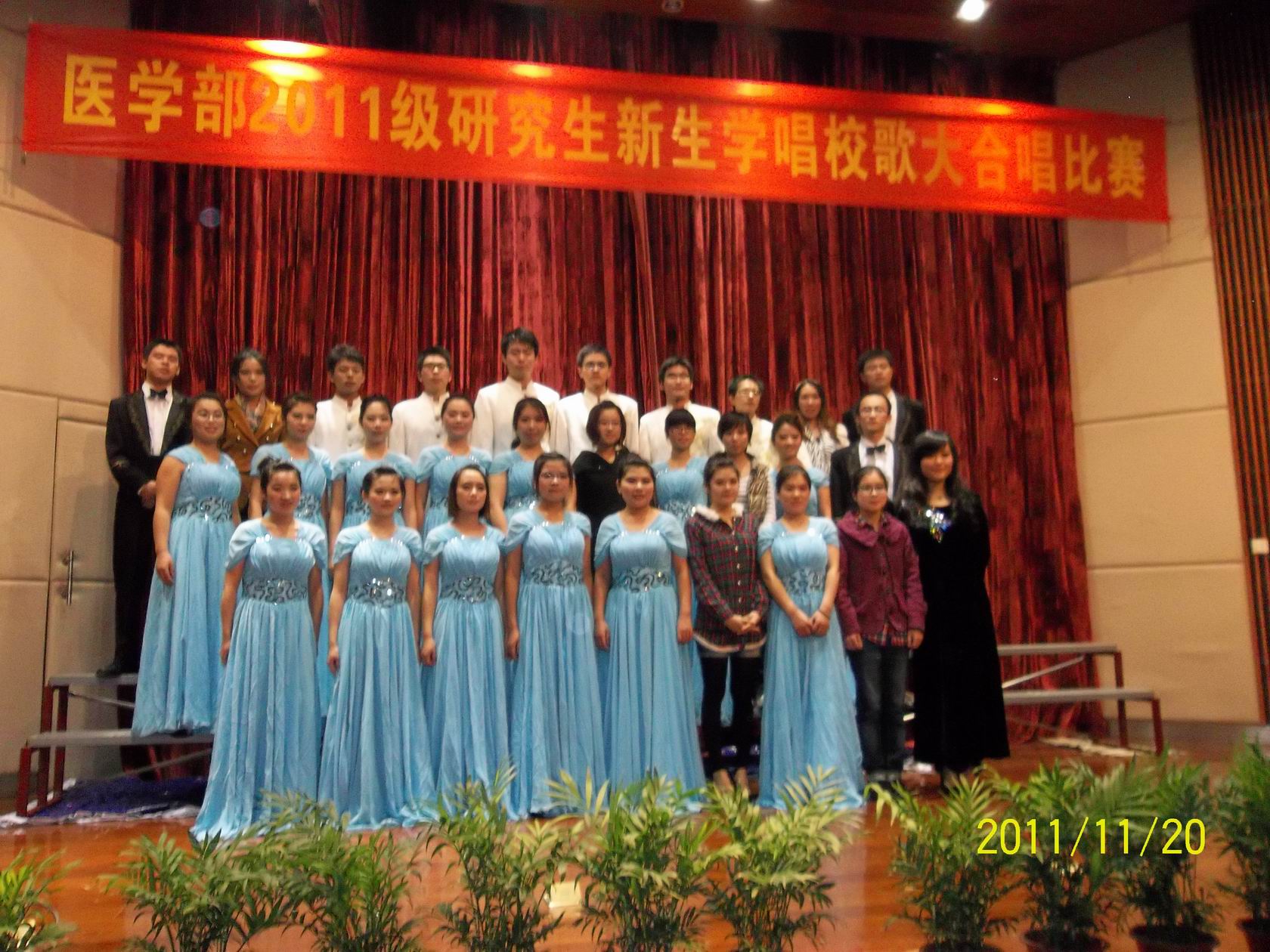 大不自多,海纳江河,白衣放歌、求是传情,树我邦国,天下来同! 20111120日晚,由浙江大学医学部主办,医学部研博会承办的2011级研究生新生学唱校歌合唱比赛在华家池校区教学楼小礼堂隆重拉开帷幕。医学部党委副书记张小玲,研工部研究生事务管理办公室副主任王莉,华家池学生管理中心主任汪苏华,医学部团委副书记李智巧、王黎芳老师担任比赛评委。浙医二院陈唯唯老师、基础系林海燕老师也到场观看了比赛。