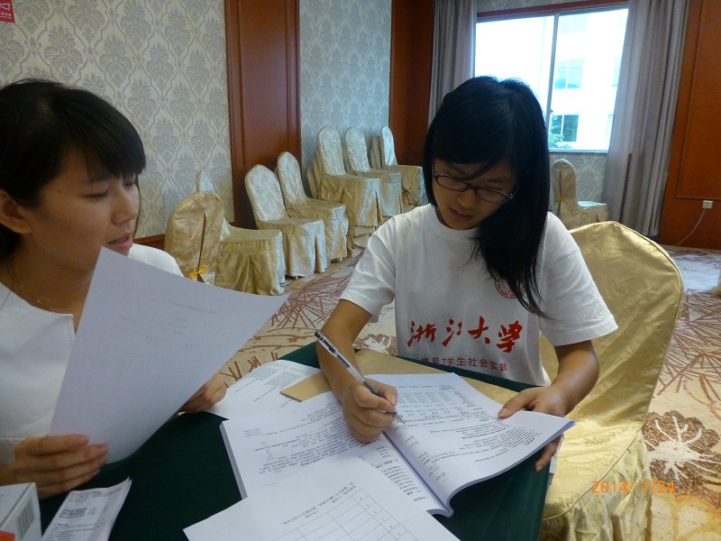 首先,由来自省疾控中心营养与食品安全所的周标科长向在座的调研人员和社会实践团队的队员们详细介绍了2014年中国居民食物消费状况调查的工作方案。他提到,昨天的居民营养健康监测其实是浙江省成立的对全国级营养调查的补充项目,从2010年起由原来的每隔10年开展一次改为每隔5年。而这个食物消费状况调查是国家级的项目,由于两个项目间有一定的重合,在入户调查时可以同时进行以提高调查的效率。周标老师也给大家普及了常用的消费量调查方法,而我们本次调查主要采用24小时回顾询问法和食物频率法。