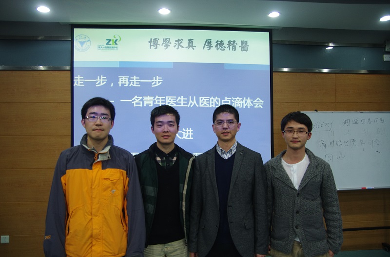 陈大进老师进行了题为“走一步,再走一步——一名青年医生从医的点滴经历”的报告,介绍了附属一院肾内科的发展情况与科室研究方向,具体形象地讲解了肾移植的关键技术创新情况与终末期肾病一体化治疗体系创建情况。他还向同学们谈起了自己的从医心路,启发同学们思考了为什么学医,现实需要怎样的医生以及怎样成为好医生的问题,向同学们传播了正能量。