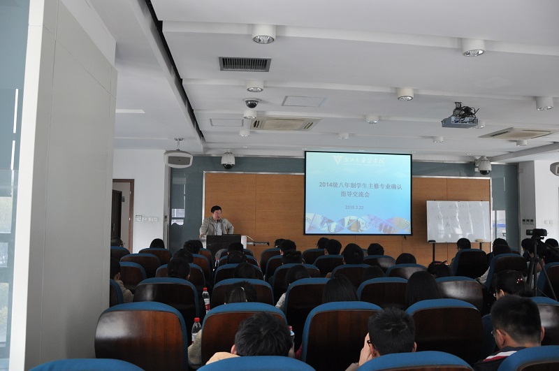 2015年3月22日下午,2014级八年制主修专业确认指导交流会在医学院综合楼205会议室顺利举行。医学院党委副书记叶旭军老师、本科生科科长刘有恃老师、本科生科副科长韩魏老师、学工办副主任杜悦老师和2005级八年制雷欣等16位学长出席了交流会,60多位2014级八年制学生参加了交流会。