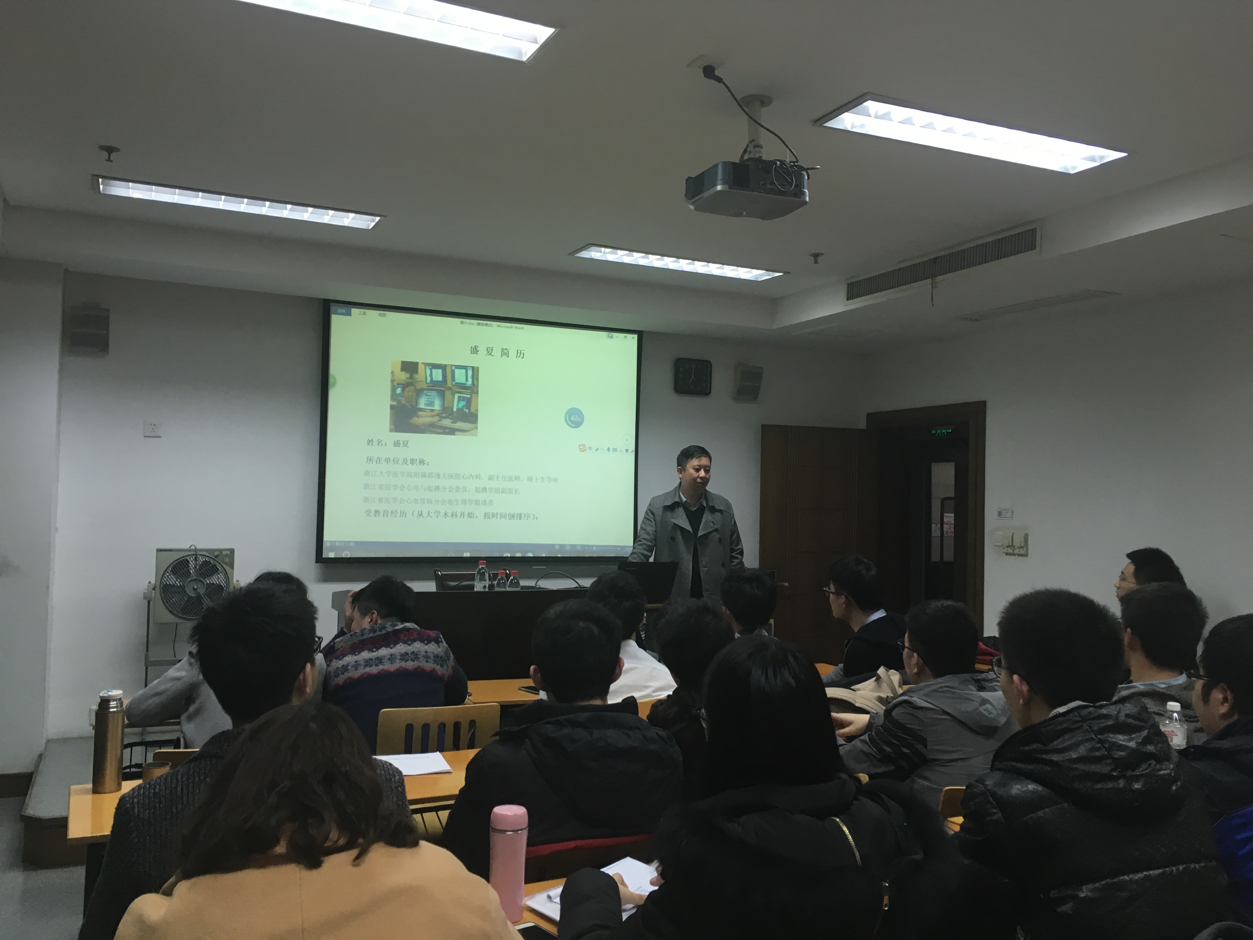 张丹老师特别邀请了浙大附属邵逸夫医院心内科盛夏主任。盛夏老师为同学们介绍了心内科各级学科的特点和前景及其学位点招生情况,告诉同学们心内课老师对学生的要求,他还说:“心内科虽然忙,但很充实,有兴趣的同学都能在这儿找到成就感。”虽然事后知道盛夏老师是刚出导管室就来见同学们了,但言语间不难看出盛老师对工作的热爱。最后,盛老师还回答了同学们就导管室辐射、心内科男女差异等方面的问题。还有肿瘤科的老师朱洪波,虽然因为临时有事没到现场,但也托张丹老师为同学们介绍肿瘤学位点的招生情况。